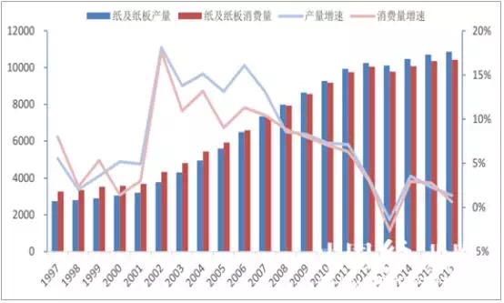 據(jù)統(tǒng)計,2010-2015年間,造紙行業(yè)共淘汰落后產(chǎn)能近4000萬噸,去產(chǎn)能效果逐步顯現(xiàn),2013年紙及紙板產(chǎn)量與消費量均出現(xiàn)下滑,2016年紙及紙板產(chǎn)量與消費量接近零增長,行業(yè)供需趨于弱平衡。